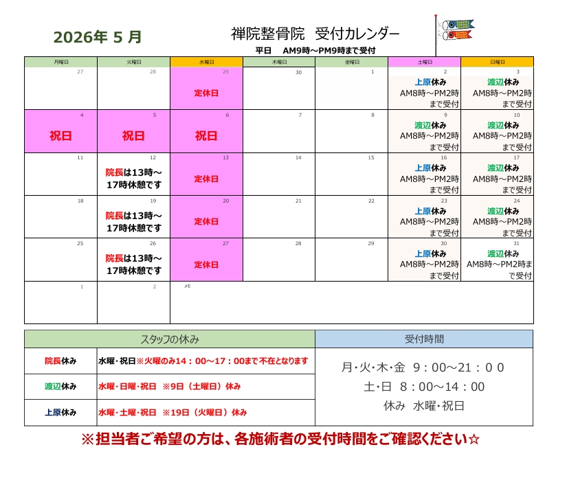 「新年度が始まり、慌ただしい日々をお過ごしの方も多いのではないでしょうか。環境の変化は、身体にも大きな影響を与えます。肩こりや腰痛、疲れが取れにくいと感じたら、早めのケアがおすすめです。皆さまの健康をしっかりサポートいたします。」